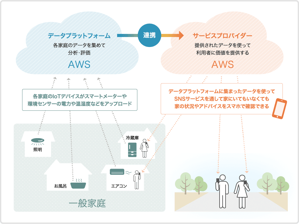 各家庭のデータ(電力、温湿度等)を収集して、分析・評価を行います。分析・評価したデータの中から、利用者に有用な情報をピンポイントで配信します。